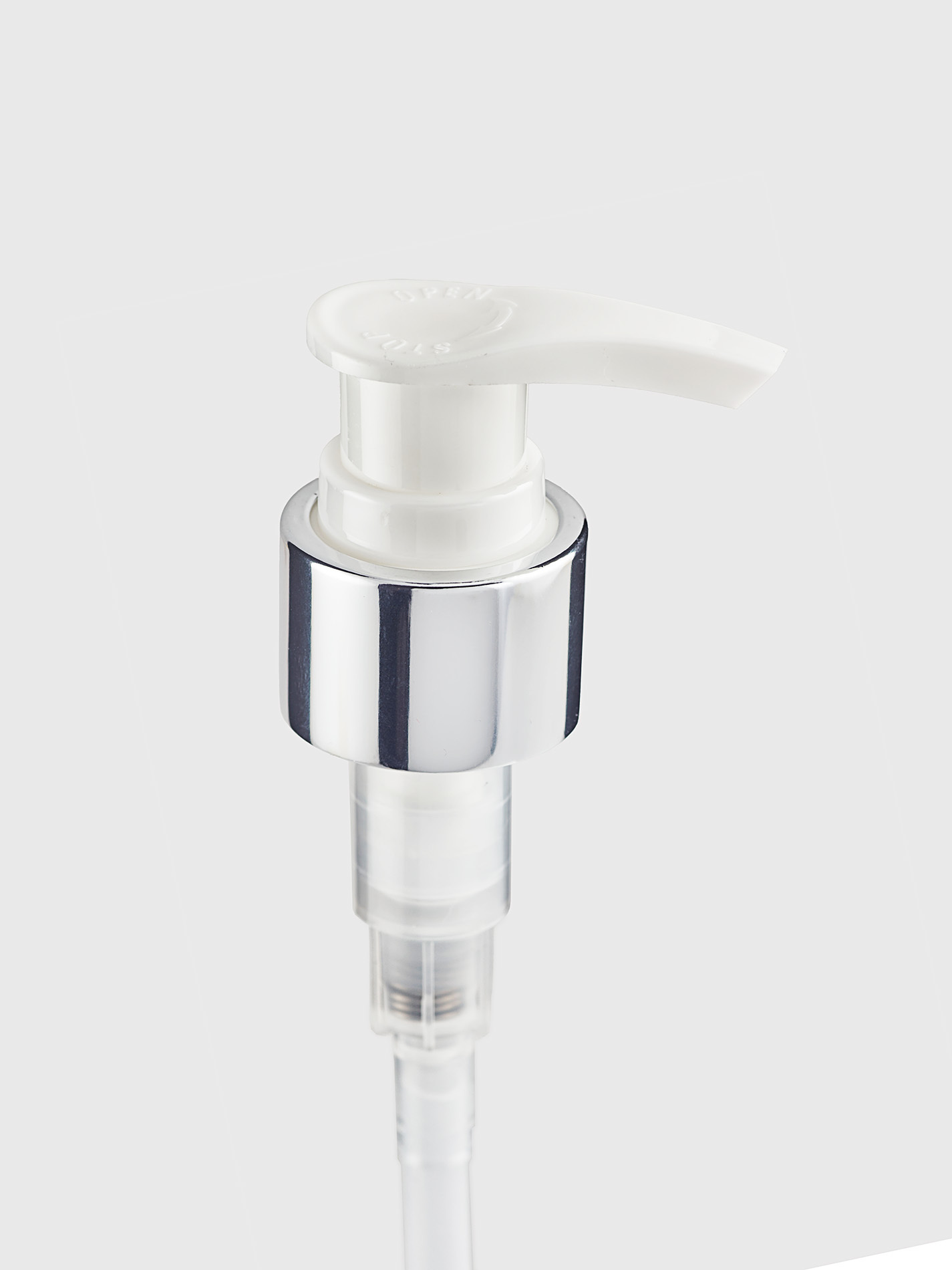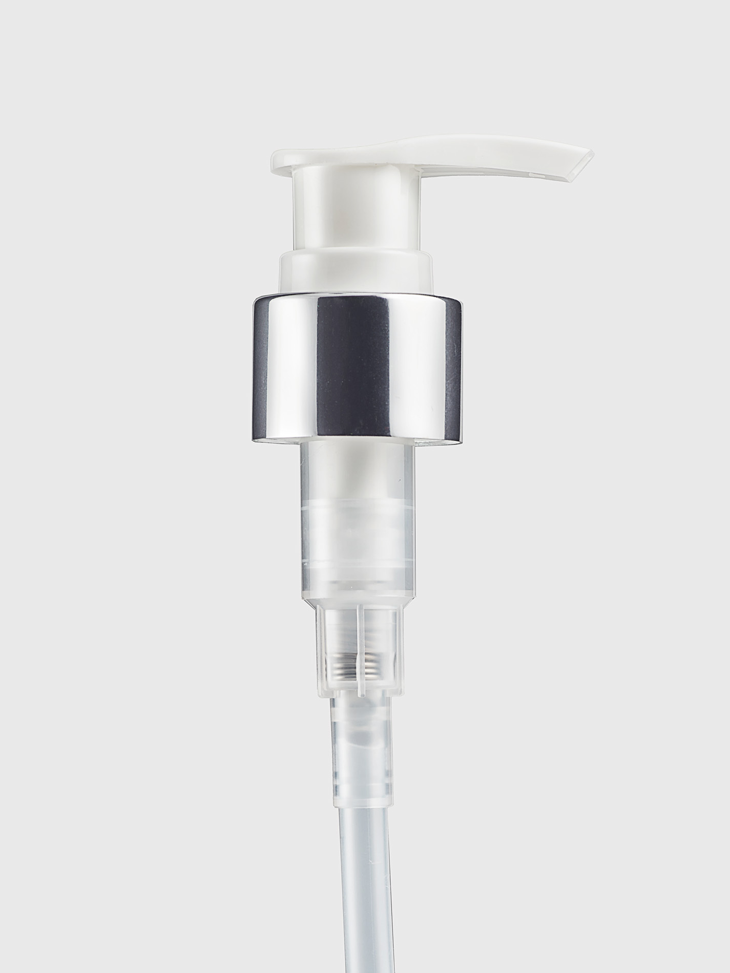 Белый пластиковый дозатор под горловину 24/410 с декоративной серебряной юбкой. Стильный и универсальный вариант для косметической продукции премиального сегмента. Подходит для лосьонов, кремов, гелей и жидких уходовых средств, обеспечивает аккуратное дозирование и удобное использование.